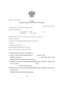 W dniu 28 kwietnia 2022 r. Sąd Apelacyjny w Szczecinie wydał wyrok, zgodnie z którym: ustalił, że umowa kredytu hipotecznego nr zawarta w dniu 2007 r. pomiędzy powodami , a Getin Noble Bank spółką akcyjną z siedzibą w Katowicach, jest nieważna, zasądził od pozwanego Getin Noble Bank spółki akcyjnej z siedzibą w Warszawie na rzecz powodów koszty procesu za I instancję, zasądził od pozwanego Getin Noble Bank spółki akcyjnej z siedzibą w Warszawie na rzecz powodów…