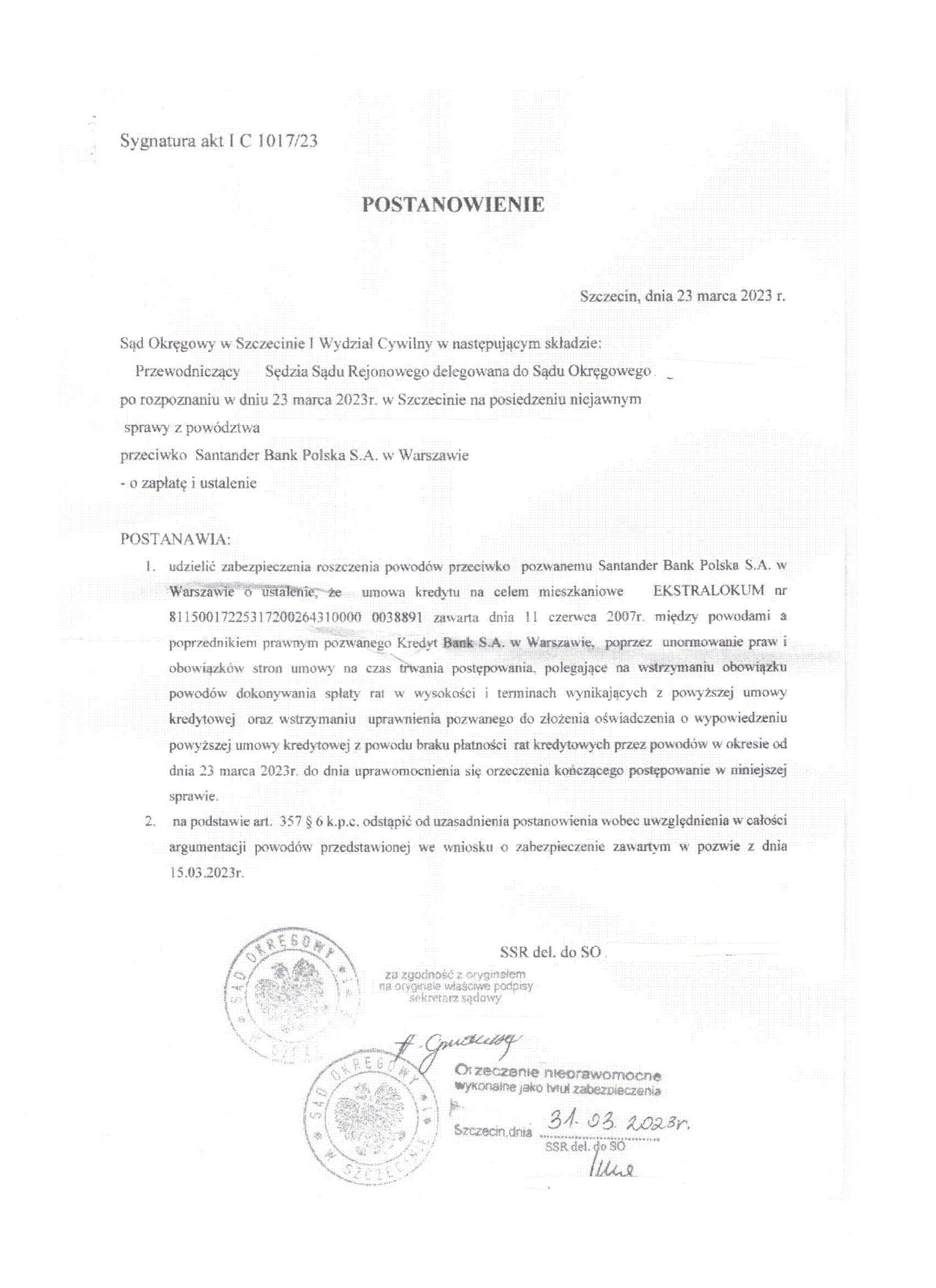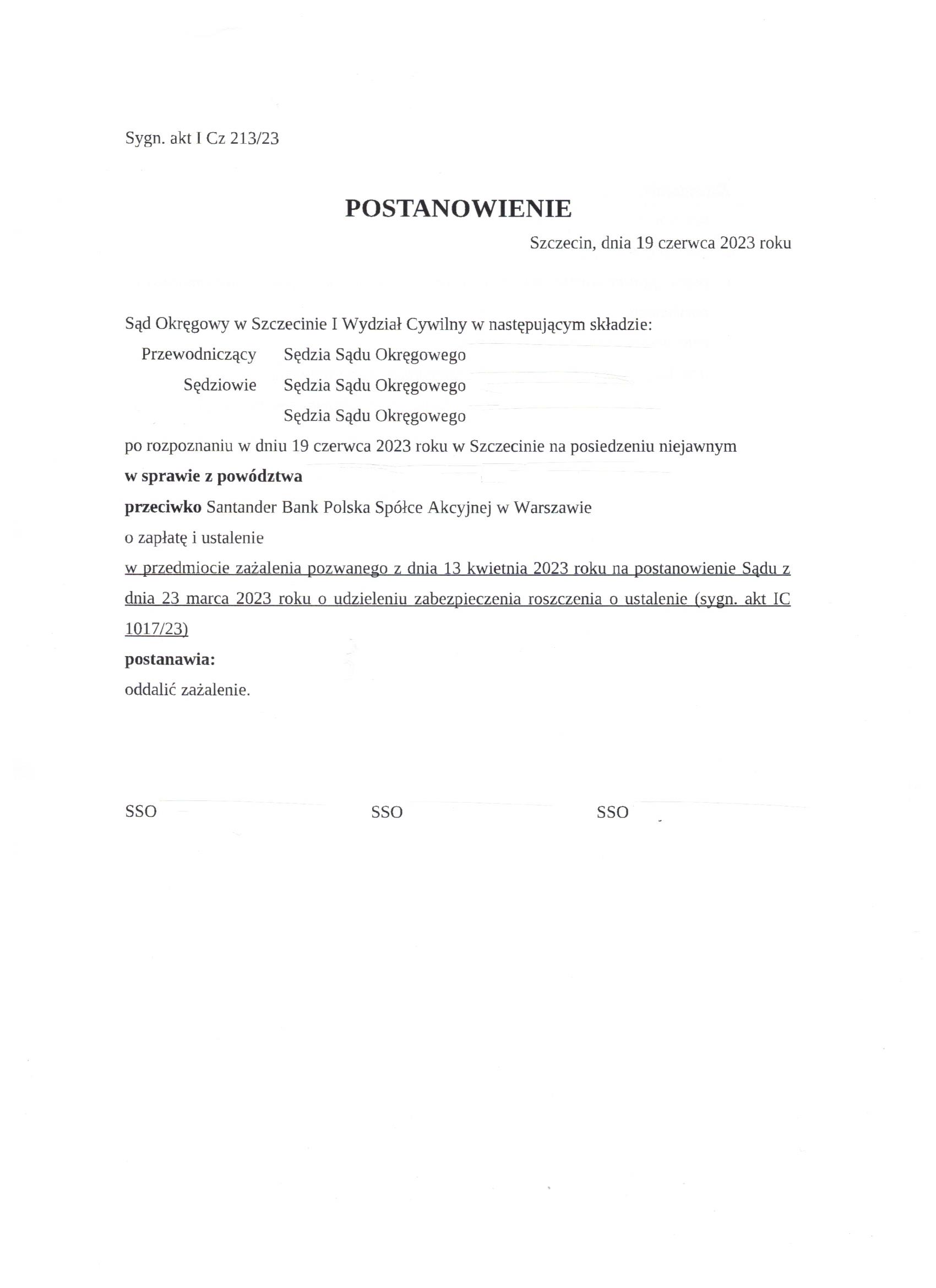 - Na skutek zażalenia Banku na postanowienie w przedmiocie udzielenia zabezpieczenia konsumentom, Sąd Okręgowy w Szczecinie oddala zażalenie Banku z uwagi na uwzględnienie w całości argumentacji strony powodowej zawartej we wniosku o zabezpieczenie roszczenia o unieważnienie umowy.