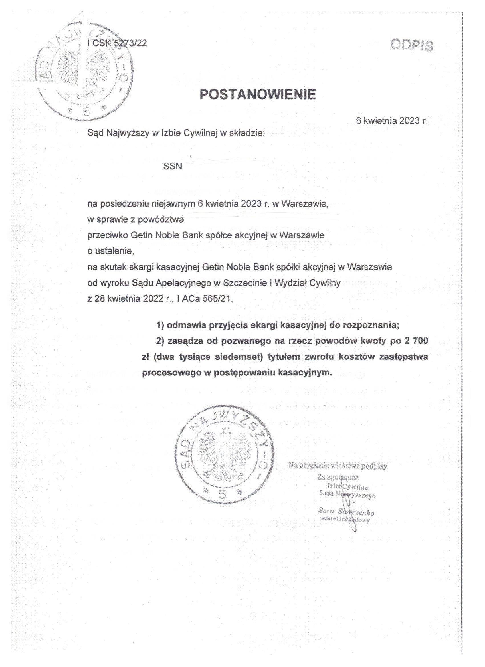 SKARGA KASACYJNA BANKU POZOSTAWIONA BEZ ROZPOZNANIA