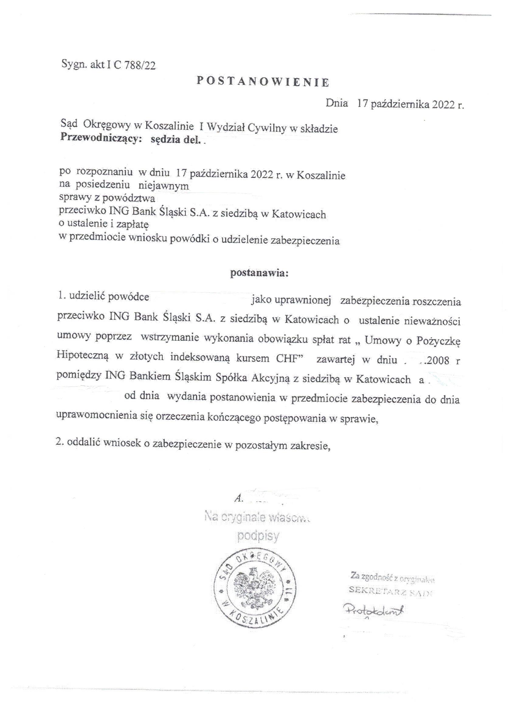 W pozwach składanych przeze mnie do Sądu zawieram wniosek o udzielenie zabezpieczenia powództwa, co skutkować może m.in. natychmiastowym wstrzymaniem obowiązku spłacania rat kredytu aż do prawomocnego zakończenia postępowania z jednoczesnym zakazaniem bankowi złożenia oświadczenia o wypowiedzeniu umowy kredytu. Jest to tzw. postępowanie zabezpieczające roszczeń niepieniężnych na podstawie art. 755 § 1 kodeksu postępowania cywilnego.